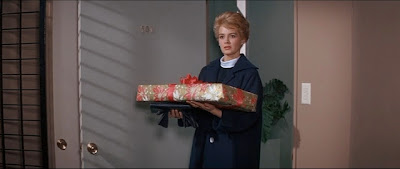 In Frank and Holm's other 1956 film, The Tender Trap, he plays a swinging New York City talent agent with a constant stream of dames, allegedly, but he only seems to be seen with Holm, whose classy carriage (she's an orchestra violinist) and Broadway wit anchor his confidence. She will puts up with his tomcatting and sticks by him because she's got nothing better going on, for now, and so the years pass. Easy sex keeps him dependent, but there's no kick. When the pair are out at a restaurant and meet marriage-minded virginal singer Debbie Reynolds (one of producer Frank's new clients), they grill her on her life goals (she wants three kids and a home in the country within five years, or bust), and she's so naive she doesn't even recognize they're kidding her. Holm gets to seem cosmopolitan here but then the censor steps in, presumably, and it's revealed Holm is just a plain old-fashioned girl, too.